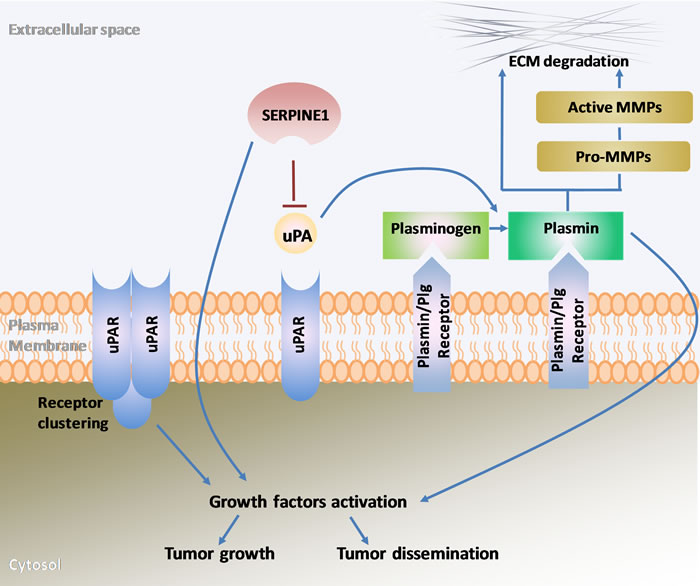 Recent findings have suggested that in addition to its role in cell dissemination and metastasis, the expression of several components of the PA system could reduce the cytotoxic effect of anticancer drugs [71]. For instance, the uPAR expression has been associated with multi-drug resistance in small cell lung cancer cells [72]. uPA, uPAR, and SERPINE1 have also been associated with the efficacy of tamoxifen treatment in breast cancer [73, 74]. A high expression of these proteins increases drug resistance.