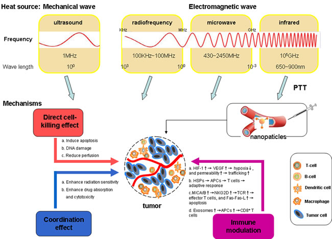 Figure 1: Heat sources used for hyperthermia purposes and different mechanisms induced by locally heating tumors. The top half of figure shows major heat sources, divided by different physical frequencies and properties, which are ultrasound, microwave and near-infrared (NIR), respectively. The energy is converted into heat by means of photothermal nanoparticles. The mechanism of killing tumor cells via the following aspects: (1) Direct cell-killing effects of HT alone (red); (2) Anti-neoplastic effect coordinated with radiotherapy and chemotherapy (blue); (3) Immune modulation (purple).