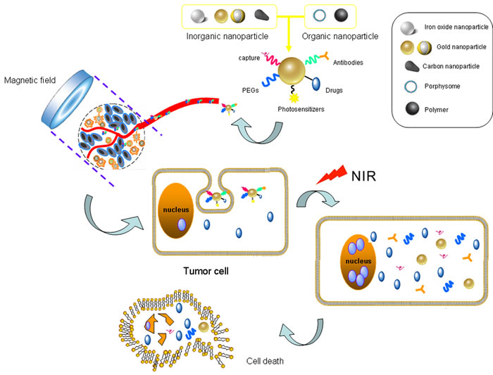 Figure 2: The near-infrared photothermal therapy (PTT) employs nanoparticles to kill tumor cells via light-induced-heating. Gold nanoparticles with multiple surface modifications are injected and recruited into tumor region guided by magnetic field and active targeting function. Tumor cells swallow these nanoparticle compounds accompanied by the loaded drugs. Near-infrared (NIR) light provides energy which are converted into heat by gold nanoparticles, and boosts tumor cell death in coordination with targeted chemotherapy.