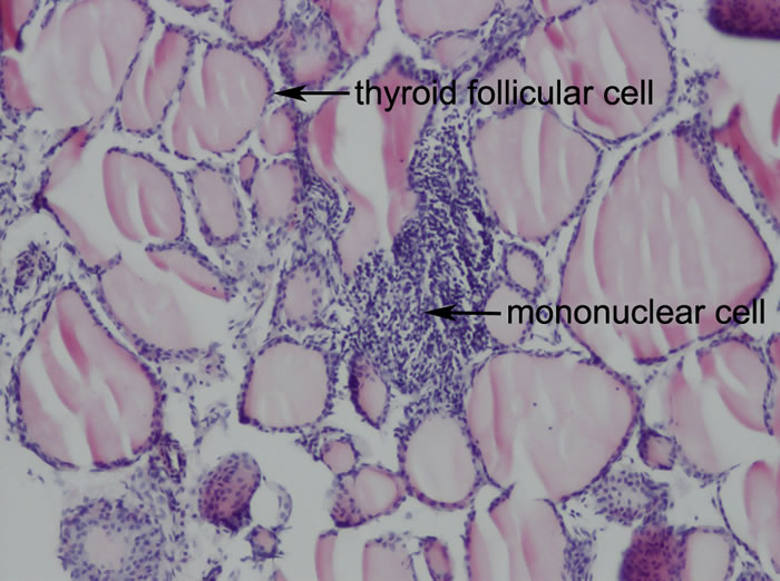 Figure 2: Representative thyroid histology of EAT mice (Original magnification: 100X). CBA/J mice were immunized twice with mouse thyroglobulin (mTg) and Freund’s adjuvant at a two-week interval. Thyroid glands were removed, fixed in 10% neutral phosphate-buffered formalin, and stained with hematoxylin and eosin (HE) for histological examination. Prominent mononuclear cell infiltration was accompanied by enlargement and destruction of thyroid follicular cells as the arrow indicates.