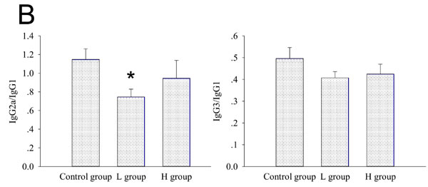 Estrogens have been known to enhance antigen-specific Ab response after antigen challenge [1, 3, 5]. Previous studies have reported that coumestrol has ER binding affinity [8, 9, 14]. In this study, the effects of coumestrol exposure on the production of TgAb, a thyroid-specific autoantibody, were assessed. In mTg-immunized mice, serum levels of Tg-specific IgG1, IgG2a, and IgG3 decreased after coumestrol exposure, whereas serum level of IgG2b remained unchanged. There were significant differences between animals exposed to low dose of coumestrol (L group) and the vehicle-treated control animals (Figure 3A). The ratio of serum anti-Tg IgG2a to IgG1 was markedly lower in the L group as compared with that of the control group (Figure 3B). It suggests that coumestrol intake suppresses thyroid autoantibody production in AIT.