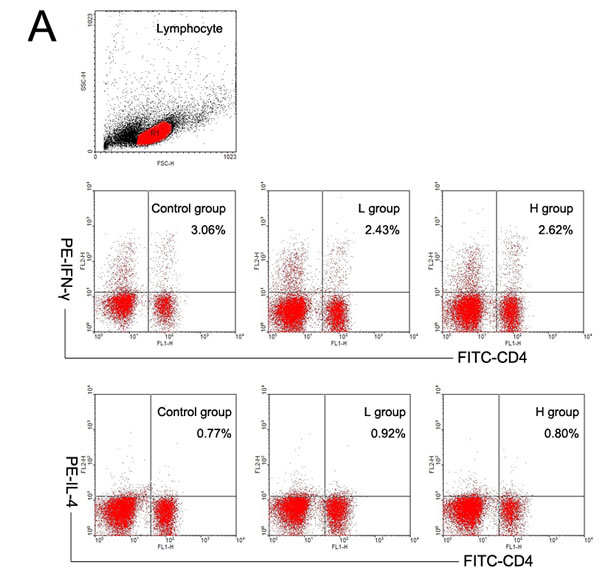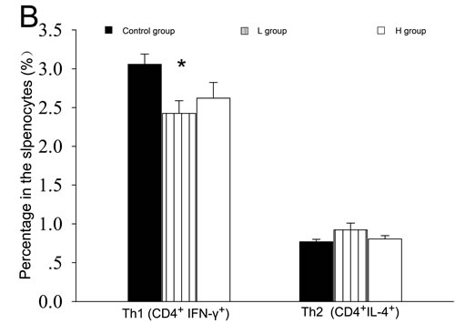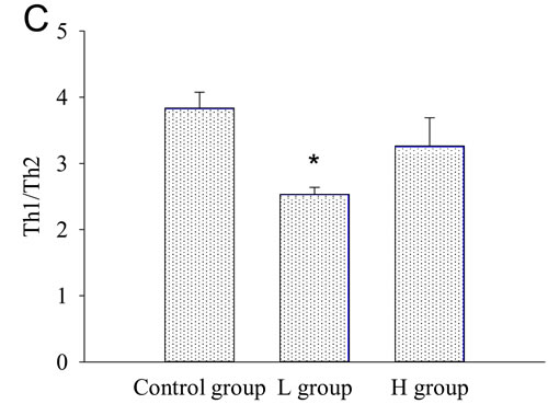 Figure 4: The effects of coumestrol exposure on the differentiation of splenic Th1 and Th2 subsets in female CBA/J mice after induction of EAT. These mice had been exposed to the drinking water containing 1% Tween80 only (Control group), 0.8 mg/l coumestrol in 1% Tween80 (L group), 8 mg/l coumestrol in 1% Tween80 (H group), respectively. Their splenic mononuclear cells (n = 5 per group) were stained with FITC-labeled anti-CD4 and PE-labeled anti-IFN- γ or IL-4 antibodies, and analyzed on a FACScan flow cytometer as shown in the representative dot plots (A.) The percentage of Th1 cells (B.) and ratio of Th1 to Th2 (C.) were significantly decreased in the L group. *P < 0.05 vs. the control group.