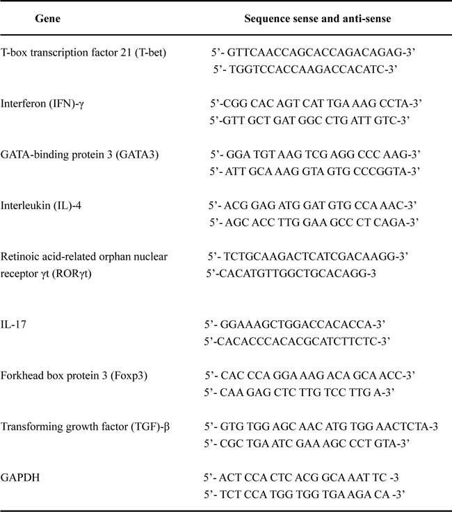 Fresh spleen specimens were immediately removed from the mice mentioned above (n = 5-8 per group) at the time of sacrifice, snap-frozen in liquid nitrogen, and then were stored at -70oC until processed. Total RNA was extracted with TRIzol reagent (Invitrogen) and reverse-transcribed into cDNA using a PrimeScriptTM RT Reagent Kit (Takara Biotechnology Co., Dalian, China) according to the manufacturer’s instructions. Real-time quantitative PCR analysis was performed using a Rotor-Gene 3000 Real-time PCR System (Corbett Research Inc., Mortlake NSW, Australia) with SYBR® Premix Ex TaqTM II (Takara) and primers specific for murine T-box transcription factor 21 (T-bet), GATA-binding protein 3 (GATA3), retinoic acid-related orphan nuclear receptor γt (RORγt), forkhead box protein 3 (Foxp3), interferon (IFN)-γ, interleukin (IL)-4, IL-17A, IL-21, and transforming growth factor (TGF)-β. These are typical cytokines and specific transcription factors to T helper (Th) cells, including Th1 (T-bet and IFN-γ), Th2 (GATA3 and IL-4) and Th17 (RORγt, IL-17A and IL-21), and regulatory T cells (Tregs; Foxp3 and TGF-β), respectively. Primers were designed and synthesized by Takara (Table 1). The transcript levels were normalized to that of murine GAPDH, and expressed as mean ± standard deviation (SD) of △Ct values.