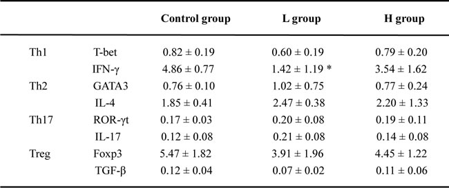 Female adult CBA/J mice were exposed to drinking water containing 1% Tween80 only (Control group), 0.8 mg/l coumestrol in 1% Tween80 (L group), 8 mg/l coumestrol in 1% Tween80 (H group), respectively. All the three groups of mice were further immunized with mouse thyroglobulin and Freund’s adjuvant for induction of EAT. The mRNA expressions of Th- and Treg-specific transcription factors and typical cytokines in the spleens were examined by quantitative RT-PCR. The transcript levels were assessed using the comparative Ct method, normalized to that of murine GAPDH, and expressed as mean ±SD of ΔCt values (n=5-8/group). Comparisons between groups were performed using one-way ANOVA followed by Bonferroni's post hoc test. *P <0.05 vs the control group.