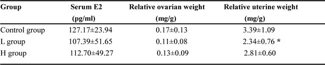 Sera, ovaries and uteri were isolated from those coumestrol-exposed female adult CBA/J mice (L and H groups) and the control animals as described above, respectively. Serum level of estradiol (E2) was determined using an EIA kit (n=10-12/group). The ovaries and uteri (n=8-10/group) were weighed after associated fat and internal fluid was removed. Their weights are presented as relative weights after normalized to body weights using the following equation: organ weight (mg)/body weight (g). Comparisons between groups were performed using one-way ANOVA followed by Bonferroni's post hoc test. *P<0.05 vs. the control group.