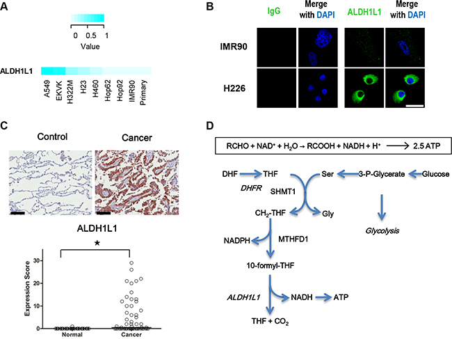 Figure 1: ALDH1L1 is highly increased in NSCLC. (A) Expression of ALDH1L1 in lung cancer cell lines was measured by multiple reaction monitoring mass spectrometry (MRM-MS). (B) Assessment of ALDH1L1 in IMR90 and H226 by immunofluorescence staining. Scale bar = 50 μm. (C) Representative immunohistochemical staining of ALDH1L1 in normal and cancerous lung tissue. Scale bar = 100 μm. Expression of ALDH1L1in cancerous (Cancer) and normal lung type I and II pneumocytes (Control). *p < 0.001, n = 57 for each case. (D) ALDH1L1 catalyses 10-formyltetrahydrofolate to THF with by-product of NADH in the serine-folate pathway. DHF, dihydrofolate; THF, tetrahydrofolate; SHMT1, serine hydroxymethyltransferase 1; DHFR, dihydrofolate reductase; CH2-THF, 5,10-Methylenetetrahydrofolate; MTHFD1, methylenetetrahydrofolate dehydrogenase1.