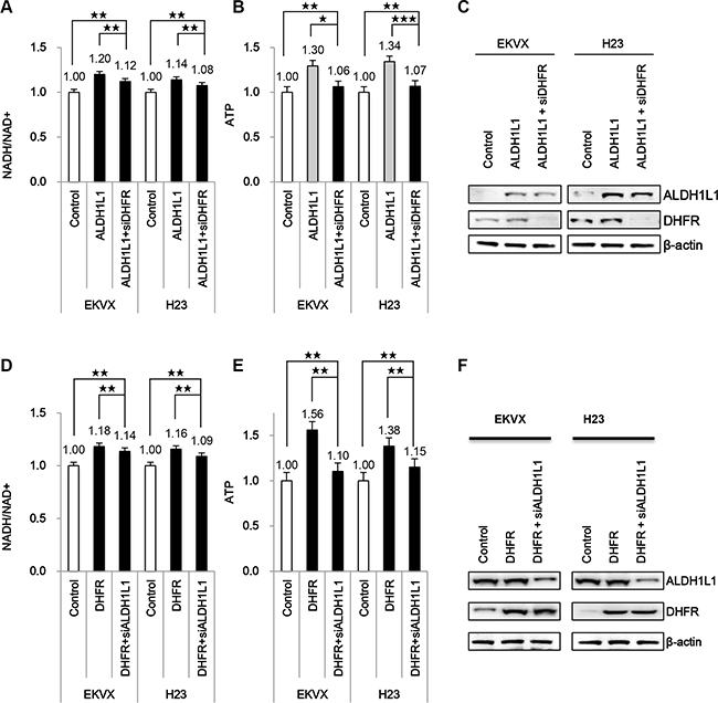 Figure 2: Effect of ALDH1L1 over expression on induction of NADH and ATP production. (A–C) EKVX and H23 cells were transfected with plasmid expressing ALDH1L1 for 24 h and incubated with siRNA of DHFR for 24 h. (D–F) EKVX and H23 cells were transfected with plasmid expressing DHFR for 24 h and incubated with siRNA of ALDH1L1 for 24 h. Effect of DHFR siRNA or ALDH1L1 siRNA on NADH/NAD+ (A, D) and ATP (B, E) was analysed. Immunoblot analysis was performed to confirm DHFR expression, ALDH1L1 knockdown (C, F). Data are representative of the mean and standard deviation three independent experiments. *p < 0.05, **p < 0.01, ***p < 0.001 compared to vehicle control.