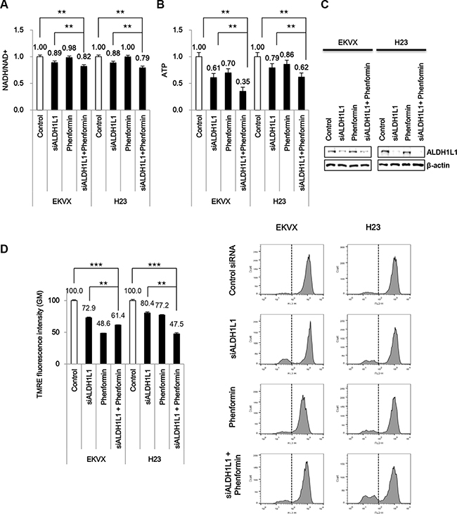 Figure 4: Phenformin treatment combined with siRNA of ALDH1L1 synergistically reduced ATP production. (A, B) After incubation with ALDH1L1 siRNA, cells were treated with 100 μM phenformin for 24 h before assessment of NADH/NAD+ (A), ATP (B). (C) Immunoblot analysis was performed to confirm ALDH1L1 knockdown. (D) Tetramethylrhodamine ethyl ester (TMRE) staining was performed to examine changes in mitochondrial membrane potential. Data are representative of the mean and standard deviation of three independent experiments. **p < 0.01, ***p < 0.001 compared to vehicle control.
