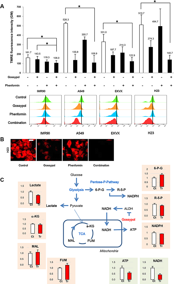 Figure 6: Combination of gossypol and phenformin remarkably reduced NADH and ATP production with down regulation of mitochondrial action potential. (A) Cells were treated as indicated for 24 h, stained for TMRE, and analysed by flow cytometry and live cell imaging. Data are representative of the mean and standard deviation three independent experiments. (B) H23 was stained for TMRE after 24 h treatment of gossypol, phenformin, and combination. Scale bar = 20 μm. (C) Effect of gossypol treatment on metabolites from various metabolic pathways in A549 cells. Relative pool sizes of metabolites by targeted LC-MS/MS upon gossypol treatment for 24 h. Data are representative of the mean and standard deviation three independent experiments. *p < 0.05 compared to vehicle control.
