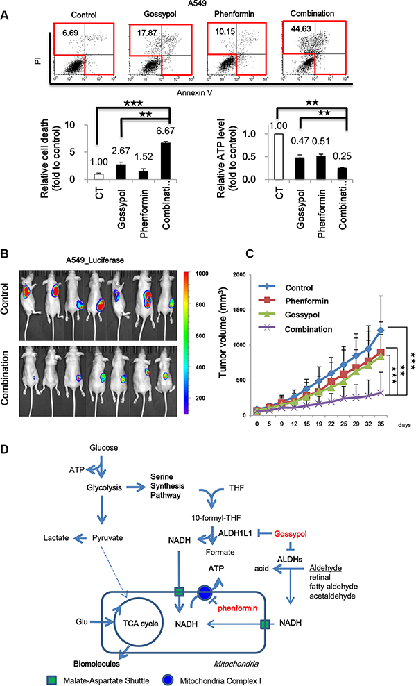 Figure 7: Gossypol combined with phenformin reversed NSCLC through induction of cell death via ATP depletion. (A) Effect of gossypol (10 μM), phenformin (100 μM), or combined treatment for 48 h on cell death as determined by flow cytometric analysis and ATP production by ATP assay. (B) IVIS imaging of A549-luciferase xenograft tumors was taken. When the tumor mass volume reached to 100 mm3, the mice were treated orally 7 days/week. (n = 7 per each group). The dissemination of cells into lungs was monitored by IVIS (Xenogen). The data were expressed as photon flux (photons/s/cm2/steradian), and photon flux for each measurement is represented by a colour scale. (C) Tumor volumes were determined as described in Materials and Methods. (D) Proposed model for the role of ALDH in NSCLC metabolism. ALDH1L1 plays a key role in ATP synthesis through NADH production. NADH produced in the cytosol needs to be transported into the mitochondria by the malate-aspartate shuttle for ATP production. Data are representative of the mean and standard deviation three independent experiments. **p < 0.01, ***p < 0.001 compared to vehicle control.