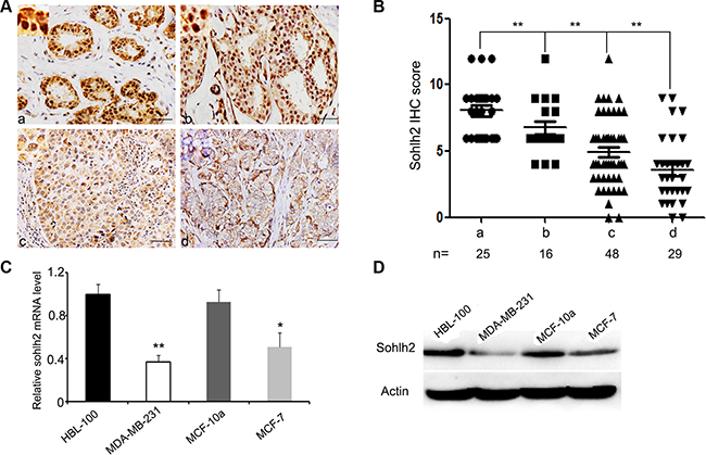 Figure 1: Reduced expression of sohlh2 is correlated with the metastasis of breast cancer. (A) Immunohistochemical staining of Sohlh2 in adjacent tissues of breast cancer (a), intraductal carcinoma in situ (b), breast cancer without or with metastasis (c, d). A representative image from each group is shown. Scale bar = 50 μm. (B) Intensity of sohlh2 staining was scored from 0 to 12. Graph representing the average intensity of sohlh2 staining for adjacent tissues of breast cancer (a) versus intraductal carcinoma in situ (b), breast cancer without or with metastasis (c, d). (C, D) The mRNA and protein expression of sohlh2 were analyzed by qPCR (C) and Western blot (D) in the transformed mammary epithelial cell lines (HBL-100, MCF-10a) and breast cancer cell lines (MDA-MB-231, MCF-7). β-actin was used as a loading control. *P < 0.05; **P < 0.01.