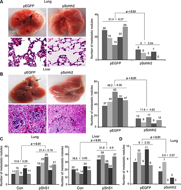 Figure 3: Sohlh2 inhibits breast cancer metastasis in mice. Sohlh2–expressing (sohlh2-silencing) or parental cells were injected into BALB/c nude mice via tail vein. The mice were sacrificed after 8 weeks, and tumor colonies in the lung and liver were examined. (A) Representative images of lung samples and sections with H&E staining (right), metastasis nodules formed by parental and sohlh2–expressing MDA-MB-231 cells were quantified (left). (B) Representative images of liver samples and sections with H&E staining at 8 wk after injection were shown (right), metastasis nodules formed by parental and sohlh2–expressing MDA-MB-231 tumors were quantified (left). (C) Metastasis nodules in lungs and livers formed by parental and sohlh2–silencing MCF-7 cells were quantified. (D) Sohlh2–expressing or parental cells were injected in mammary pad of BALB/c nude mice. Spontaneous metastasis nodules in lungs formed by parental and sohlh2–expressing MDA-MB-231cells were quantified. Arrows show metastasis nodules. Scale bars indicate 50 μm.