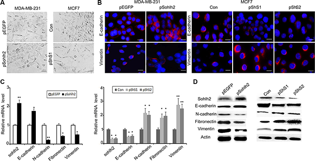 Figure 4: Sohlh2 suppresses EMT in breast cancer cells. (A) Phase contrast photographs show that pShS1-transfected MCF7 cells display fibroblastic morphology with increased cell spreading, while pSohlh2-transfected MDA-MB-231 cells display epithelial morphology. Scale bar = 100 μm. (B) Immunostaining of E-cadherin and vimentin in MDA-MB-231 and MCF-7 cells. The nuclei were stained by DAPI. Scale bar = 50 μm. (C) The mRNA expression of EMT markers including E-cadherin, N-cadherin, Fibronectin and vimentin in sohlh2-overexpressing MDA-MB-231 cells or sohlh2-ablated MCF-7 cells was examined by qPCR. (D) Cell lysates were prepared and the protein expression of EMT markers was analyzed by immunoblotting. β-actin was used as an internal control. All results are obtained from three independent experiments. *P < 0.05; **P < 0.01.