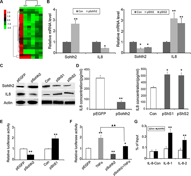 Figure 5: Sohlh2 regulates IL-8 expression. (A) Supervised hierarchical clustering of differentially expressed genes after sohlh2 knockdown in MCF-7 cells. (B, C) The mRNA (B) and protein (C) expression of IL-8 and sohlh2 in breast cancer cell lines. β-actin was used as a loading control. (D) Measurement of IL-8 secretion in sohlh2-overexpressing MDA-MB-231 and sohlh2-ablated MCF-7 cells by ELISA. E. Inhibition of pGL4-IL-8 luciferase activity by sohlh2 overexpression in MDA-MB-231 cells, and activation of pGL4-IL-8 luciferase activity by sohlh2 silencing in MCF-7 cells. (F) Sohlh2 partially repressed the activation of IL-8 promoter caused by TNFα. ▲▲P < 0.01. (G) ChIP assay was carried out in sohlh2-overexpressing MDA-MB-231 cells. qPCR was performed to determine sohlh2 occupied abundance on IL-8 promoter with 2 primer pairs spanning E-Motifs and one control primer. qPCR results showed that sohlh2 bound to the specific regions of IL-8 promoter. Results represent mean ± SD from three independent experiments. *P < 0.05; **P < 0.01.