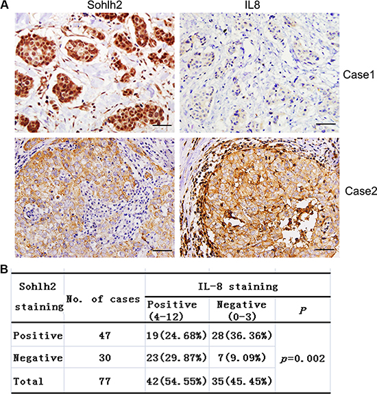 It has been reported that breast cancer patients who have abundant IL-8 protein expression are more likely to develop distant metastases and have a poor survival outcome [14–16]. To investigate the correlation between sohlh2 and IL-8 expression in breast cancer tissues, immunohistochemistry analysis was then performed on 77 paraffin-embedded breast cancer tissue samples. Two cases with typical sohlh2 and IL-8 staining are shown in Figure 7A. A significant correlation between sohlh2 and IL-8 expression (P = 0.002, Figure 7B) was found. IL-8 expression was negatively correlated with sohlh2 expression in breast cancer tissues. These results suggest the presence of a sohlh2/IL-8 signaling in breast cancer samples.