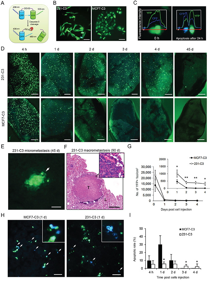 Figure 1: 231-C3 cells are more metastatic and durable than MCF7-C3 cells in mice. A. Schematic representation of FRET sensor for detecting caspase-3/-7 activation during apoptosis. B. FRET images of 231-C3 and MCF7-C3 cells in normal condition. Scale bars represent 100 μm. C. Fluorescence intensities of YFP and CFP of MCF7-C3 cells at 0 and 24 hours after 3 minutes of UV irradiation. D, G-I. Metastatic ability was determined by injecting sensor cells into the tail vein of nude mice and observing metastases on the lung. Distribution of 231-C3 and MCF7-C3 cells on the lung was revealed by FRET imaging (D, scale bars represent 1 mm). Cell viability was determined by counting YFP+ cells from 0-4 days (outer panel) and 1-4 days (inner panel) (G). Apoptotic rates (I) were determined by analyzing the FRET images (H, white arrows indicate blue apoptotic cells). Scale bars represent 100 μm. E and F. Representative FRET image of 231-C3 micrometastasis (white arrow) at day 45 (E), and H&E staining of a macrometastatic tumor (T) in lung tissue (L) at day 90 (F). Scale bar represents 100 μm in (E) and 500 μm in (F). The data are the mean ± SD from all lung samples of all three mice. *P < 0.05, **P < 0.01 by Student’s t test, 231-C3 vs. MCF7-C3 cells.