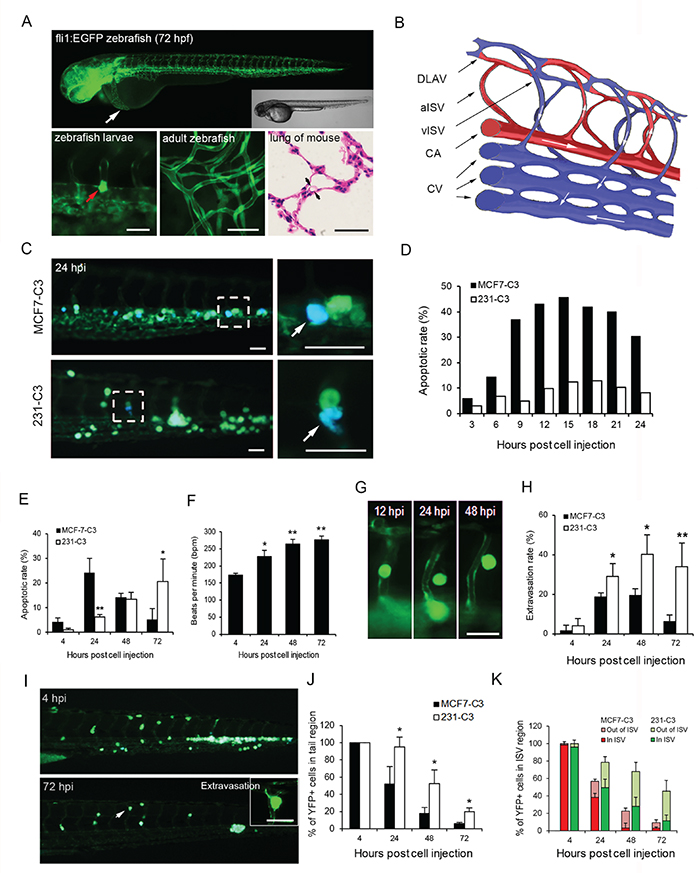 Figure 2: Metastatic cells are more resistant to SS-induced apoptosis in zebrafish. A. Upper panel: transgenic Tg (fli1:EGFP) zebrafish larvae expressing EGFP in the vascular system at 72 hours post fertilization were visualized using fluorescence and DIC microscopy. The white arrow indicates the injection site of cancer cells. Lower panels: larval zebrafish blood vessel diameter (left) in comparison with those of adult zebrafish capillaries (middle) and mouse pulmonary alveoli (right). A cancer cell larger than the small blood vessel is indicated by a red arrow (left). B. Schematic diagram illustrating the structure of blood vessels of zebrafish in the observation window. DLAV: dorsal longitudinal anastomotic vessel, aISV: arterial intersegmental vessel, vISV: venous intersegmental vessel, CA: caudal artery, and CV: caudal vein. C-E. The apoptotic rates of sensor cells circulating in zebrafish were determined by FRET imaging analysis. Representative FRET images of sensor cells with a blue apoptotic cell enclosed in the dashed boxes and enlarged in the right panels (C). Quantified apoptotic rates within 24 (D) and 72 hours post injection (E); n = 200-300 cells at each time point. F. Heart rates in control zebrafish larvae were counted after cells were injected. G and H. Extravasation of sensor cells was determined by their position in ISVs of the tail region by YFP imaging. YFP images of MCF7-C3 cells during extravasation (G) and rates of sensor cell extravasation (H). I-K. Location of 231-C3 cells in the tail region of zebrafish revealed by FRET imaging (I). Percentages of YFP+ sensor cells located in the whole tail region (J), or cells located in and outside of the ISVs (K) were determined by counting cells; n ≥ 5 fish, and n = 20-50 sensor cells per fish. The data are the mean ± SD. *P < 0.05, **P < 0.01 by Student’s t test: 231-C3 vs. MCF7-C3 cells. All scale bars represent 50 μm.