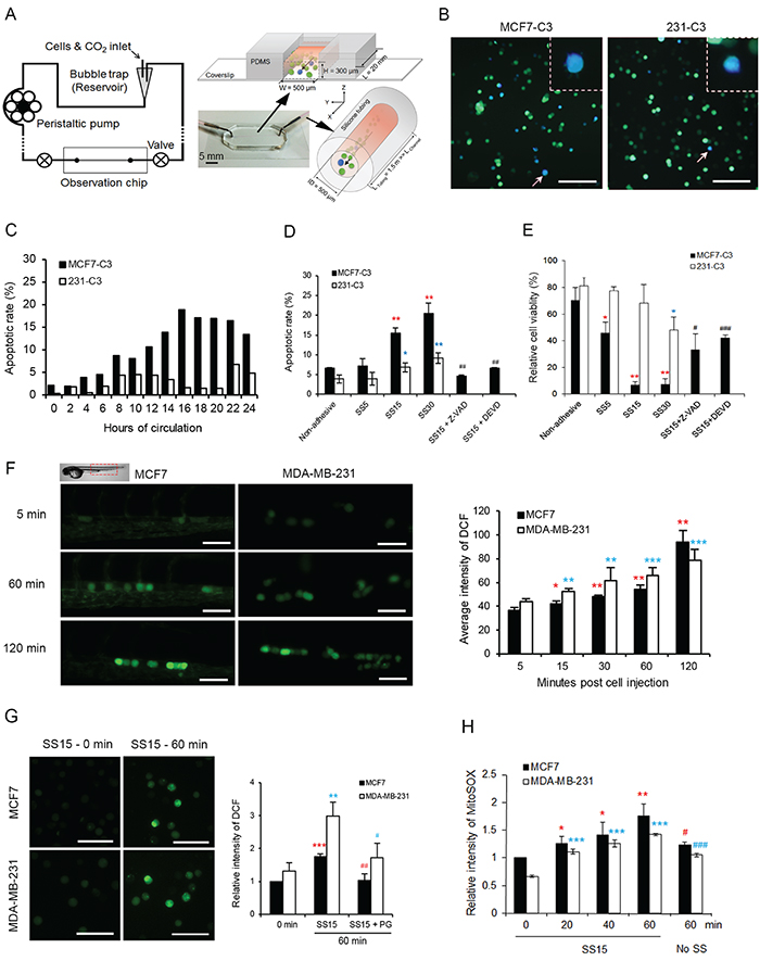 Figure 3: Fluid SS elevated levels of ROS and induced apoptosis in CTCs. A. Diagram of a new microfluidic circulatory system for generating pulsatile SS. B and C. Effect of SS15 on apoptosis was determined in sensor cells. Representative FRET images of sensor cells with apoptotic blue cells indicated by white arrows and enlarged in the dashed boxes (B). Scale bars represent 100 μm. Apoptotic rates were determined by FRET imaging (C); n > 200 sensor cells for each time point. D and E. Apoptotic rates were determined by FRET imaging (D), and cell viabilities were quantified by the MTT assay (E) in sensor cells pre-treated with or without Z-VAD-FMK (Z-VAD, 20 μM) or caspase-3/-7 inhibitor Ac-DEVD-CHO (DEVD, 10 μM) for 1 hour. Cells grown in non-adhesive-coated wells were used as a negative control. *P < 0.05, **P < 0.01 by Student’s t test: SS5-SS30 vs. non-adhesive condition. #P < 0.05, ##P < 0.01, ###P < 0.001 comparing with and without inhibitors under SS15 treatment. F. ROS levels were determined by CM-H2DCFDA staining-based fluorescence microscopy in MCF7 and MDA-MB-231 cells injected in zebrafish larvae. n = 100-200 cells from > 10 fish. Scale bars represent 50 μm. G. ROS levels were measured as described in (F) from cells that circulated under SS15 in a microfluidic system with or without 20 μM PG. The average intensity from 200 cells was calculated in each sample, and the results represent the mean ± SD from three independent experiments. **P < 0.01 and ***P < 0.001 by Student’s t test: 60 vs. 0 minute.#P < 0.05, ##P < 0.01, comparing with and without PG under SS15 for 60 minutes H. Levels of mitochondrial superoxide were determined by MitoSOX (10 μM) staining and flow cytometry analysis. A non-adhesive condition with no shear stress was used as a negative control. The average intensity from 10,000 cells was calculated in each sample, and the results represent the mean ± SD from three independent experiments. *P < 0.05, **P < 0.01 and ***P < 0.001 by Student’s t test: other times vs. 0 minute.#P < 0.05, ##P < 0.01, ###P < 0.001 comparing SS15 with no shear at 60 minutes.
