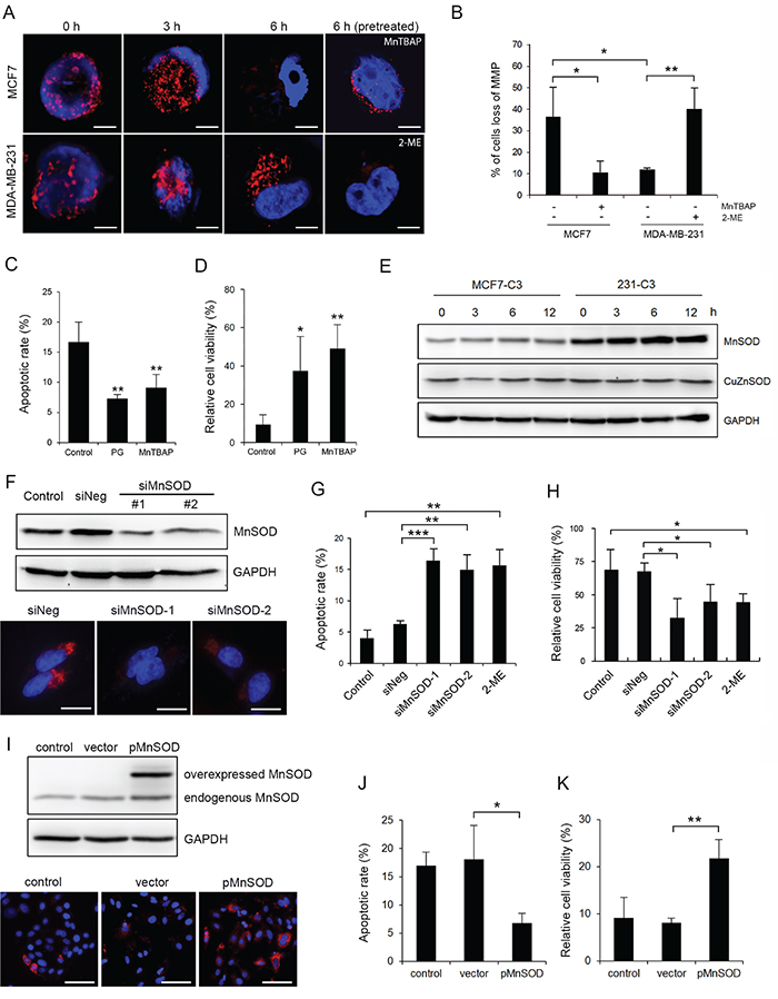 Figure 4: MnSOD protects metastatic cells from SS-induced mitochondrial damage and apoptosis. A and B. Mitochondrial membrane potential (MMP) was examined by staining MCF7 and MDA-MB-231 cells with MitoTracker Red-CMXRos after circulation. MCF7 cells were pre-treated with MnTBAP (100 μM) and 231 cells were pre-treated with 2-ME (20 μM) before circulation (A). Scale bars represent 5 μm. The percentages of cells with lost MMP were quantified from more than 200 cells (B). C and D. MCF7-C3 cells were pre-treated with or without PG (20 μM) or MnTBAP (100 μM) and circulated for 18 hours. Apoptotic rates were measured by FRET imaging (C), and cell viabilities were quantified using the MTT assay (D). E. Expression of CuZnSOD and MnSOD was determined by Western blotting. GAPDH was used as a loading control. F. Knockdown efficiency of MnSOD in 231-C3 cells was examined by Western blotting and IF staining. Scale bars represent 10 μm. G and H. Effects of MnSOD knockdown using siRNAs or inhibiting its activity using 20 μM 2-ME on 18 hours of SS-induced apoptosis were determined by FRET imaging in 231-C3 cells (G), and those same effects on cell viability were measured using the MTT assay (H). I-K. Effects of overexpression of MnSOD on 18 hours of SS-induced apoptosis were determined. Expression of MnSOD in MCF7-C3 cells transfected with MnSOD plasmid or vector alone was examined by Western blotting and IF staining (I). Apoptotic rates were determined by FRET imaging (J), and cell viability was measured using the MTT assay (K). The results represent the mean ± SD from three independent experiments. *P < 0.05, **P < 0.01, ***P < 0.001 using Student’s t test either comparing experimental groups with the control group or as indicated in the graphs. All cells subjected to the microfluidic circulatory system in this figure were under SS15. Nuclei were stained with Hoechst 33342 (blue). Scale bars represent 100 μm.