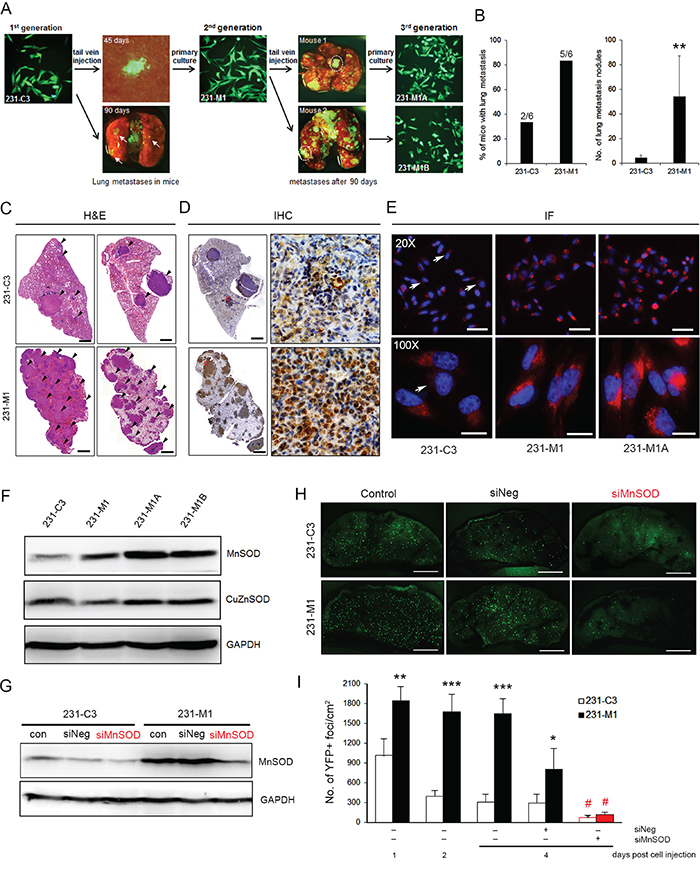 Next, we examined whether high levels of MnSOD can increase the metastatic capacity of breast cancer cells by establishing three generations of 231-C3 cells (Figure 7A). 231-M1 cells were isolated from lung micrometastases on the 45 days after 231-C3 cells were injected into the tail vein of nude mice (Figure 1E). These 231-M1 cells were considered to be more malignant than the 231-C3 cells, as many more lung metastases with much larger tumor sizes were formed in five out of six mice after the mice received an injection of 231-M1 cells into their circulatory system. Two cell lines were further isolated from two 231-M1 metastatic tumors, namely, 231-M1A and 231-M1B (Figure 7A-7C). IHC analysis showed that 231-M1 lung metastatic tumors had much higher and more uniform expression of MnSOD than 231-C3 lung metastasis (Figure 7D). The 231-M1A and M1B cells displayed even more homogenous and higher expression of MnSOD than did the 231-M1 and 231-C3 cells (Figure 7E and 7F).