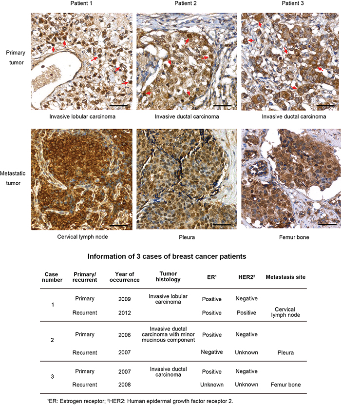 We also compared the levels of MnSOD between primary and metastatic human breast tumors. Three cases of invasive breast cancer were identified, and samples of both primary and metastatic tumors that had formed at the cervical lymph node, pleura and femur bone after surgical excision of the primary tumors were obtained. IHC analysis of formalin-fixed, paraffin-embedded tissue samples revealed that the metastatic tumors displayed a higher and more homogenous expression of MnSOD than did the primary tumors, in which only some of the tumor cells displayed high MnSOD staining (Figure 8, red arrows). The patients’ information is summarized in Figure 8.