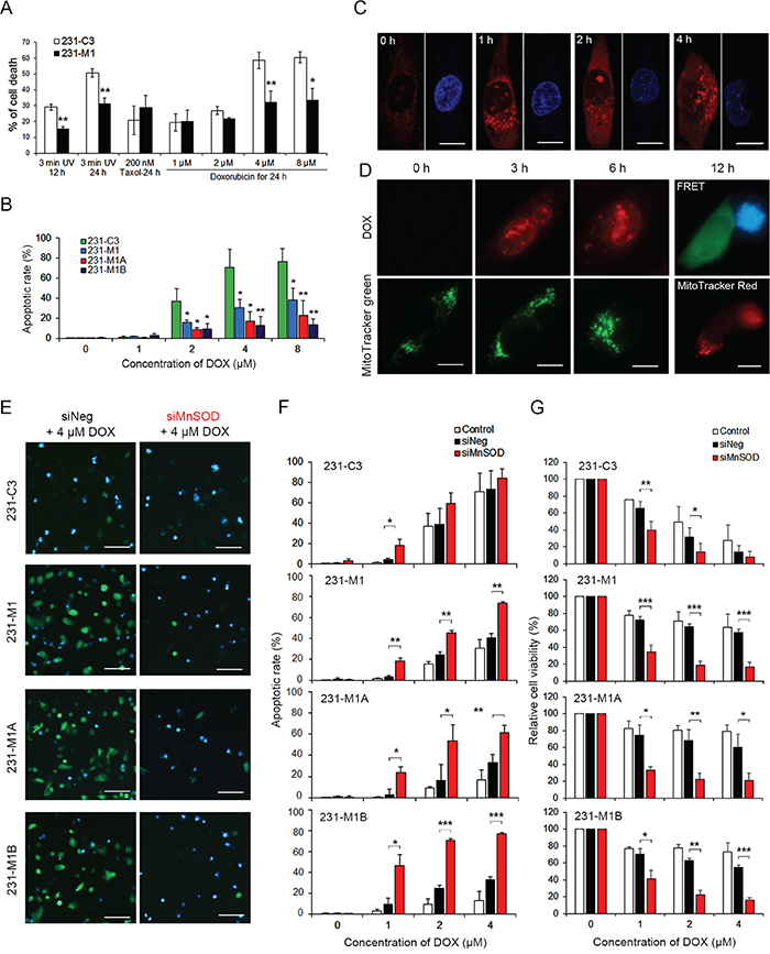 Figure 9: High levels of MnSOD confer resistance to DOX and knockdown of its expression sensitizes cells to DOX treatment. A. Effects of three death inducers, 3 minutes of UV irradiation, Taxol and DOX, on 231-C3 and 231-M1 cells were determined using the MTT assay. *P < 0.05, **P < 0.01 using Student’s t test: 231-M1 vs. 231-C3 cells. B. Apoptotic effects of DOX on 231-C3 series cells were quantified by FRET imaging analysis. C. DOX-mediated production of mitochondrial superoxide was determined by staining MDA-MB-231 cells with 5 μM MitoSOX. Nuclei were stained with Hoechst 33342 (blue). Scale bars represent 5 μm. D. Effects of DOX (4 μM, red) on mitochondrial morphology in MDA-MB-231 cells were revealed by staining cells with 100 nM MitoTracker Green (green). Live cells (green) and apoptotic cells (blue) were revealed by FRET imaging and their mitochondrial morphologies were revealed by staining cells with 100 nM MitoTracker Red. Scale bars represent 5 μm. E-G. 231-C3 series cells were transfected with negative siRNA (siNeg) or MnSOD siRNA-#1 (siMnSOD) and treated with 0, 1, 2, 4 μM DOX for 24 hours. FRET images of sensor cells treated with 4 μM DOX (E). Scale bars represent 100 μm. Apoptotic rates of these sensor cells were quantified by FRET imaging (F), and cell viability was measured using the MTT assay (G). The results represent the mean ± SD from three independent experiments. *P < 0.05, **P < 0.01, ***P < 0.001 using Student’s t test comparing with the control group or as otherwise indicated in the graphs.