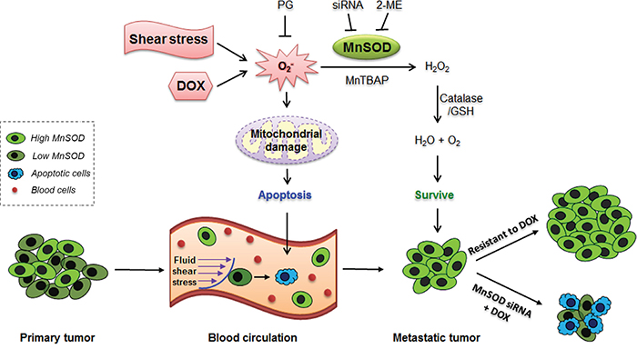 In this study, we discovered an interconnection between three major events in cancer development and treatment: CTC survival, metastasis, and resistance to the first-line anti-cancer agent DOX (Figure 10). These three events are unlikely to occur independently, but they may stem from one common origin, which is a high expression level of MnSOD. We propose that when cancer cells enter into the circulation and become CTCs, the fluid SS present in the human artery can increase the levels of superoxide, which damages mitochondria. For CTCs with lower levels of MnSOD, they can be killed by SS-induced apoptosis in circulation. However, cells with higher levels of MnSOD can survive SS-induced apoptosis and further develop into metastatic tumors. This explains why MnSOD expression is both more uniform and higher in metastatic tumors formed in mice (Figure 7D), in malignant tumors of breast cancer patients (Figure 8), and in the results of previous clinical studies [26–28]. We further confirmed that this high expression of MnSOD can be inherited by CTC progeny during metastasis. For example, the 231-C3 series cells isolated from metastatic tumors exhibited higher levels of MnSOD compared with their parental cells (Figure 7A-7F).