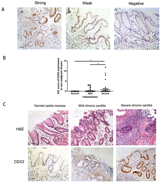 Figure 1: CDX2 expression in non-malignant gastric cardia tissues. A. Variable levels of CDX2 were detected by immunohistochemistry in a small number of non-malignant gastric cardia tissues. Analysis was based on nuclear staining. Patient samples were categorized into strong (a), weak (b) and negative (c) (IHC stain, scale bar, 50 μm). B. Boxplot shows that the IHC score for CDX2,at different inflammation levels, shows that CDX2 expression was significantly higher in the severe inflammation cases involving normal tissues. C. Gastric cardia epithelial cases were stained with hematoxylin and eosin (H&E) and immunohistochemistry. Variable expression levels of CDX2 were detected for different severities of inflammation (IHC stain, scale bar, 50 μm) (*p<0.05).
