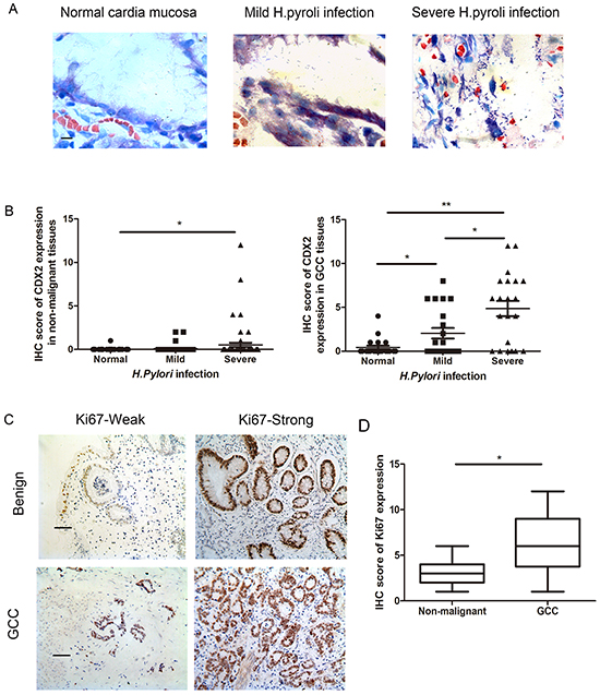 Figure 3: H. pylori infection and Ki67 expression in patient samples. A. H. pylori infection was identified by Giemsa staining and the bacterial density was graded according to the Updated Sydney System. (Giemsa stain, scale bar, 5 μm). B. Boxplot shows that IHC scoresfor CDX2 were significantly higher in the severe H. pylori infection cases than the cases with no or mild H. pylori infection in both non-malignant gastric cardia and GCC tissues. C. IHC staining of Ki67 in non-malignant gastric cardia and GCC tissues (IHC stain, scale bar, 50 μm). All cases were divided into weak and strong subgroups. D. Boxplot shows that the expression of Ki67 is higher in GCC compared to the non-malignant cardia cases (IHC stain, scale bar, 50 μm) (*p<0.05, **p<0.01).