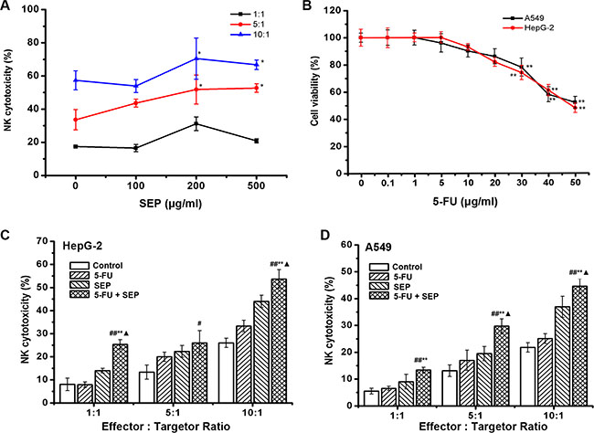 Figure 1: SEP promotes the cytotoxicity of NK-92 cells and, coordinated with 5-FU, enhances the cytolytic effect of NK-92 cells against HepG-2 and A549 cells. (A) SEP up-regulated NK-92 cell cytotoxicity against K562 cells in a dose- and ratio-dependent manner. n = 3, The data were shown as the means ± SD, *P < 0.05 compared with the untreated group; (B) The cytotoxicity of 5-FU on HepG-2 or A549 cells were measured by an MTT assay. The data represent the means ± SD of three independent experiments. **P < 0.01 compared with the untreated group; (C–D) SEP combined with 5-FU stimulated NK-92 cytotoxicity against HepG-2 (C) and A549 (D) cells. NK-92 cells were treated with SEP (200 μg/mL) for 24 h, and the HepG-2 and A549 cells were treated with 5-FU (20 μg/mL) for 24 h before initiation of the cytolytic assay. The data represent the means ± SD of three independent experiments. #P < 0.05 and ##P < 0.01 compared with the untreated group; *P < 0.05 and **P < 0.01 compared with the 5-FU (20 μg/mL)-treated group; ▲P < 0.05, compared with the SEP (200 μg/mL)-treated group.
