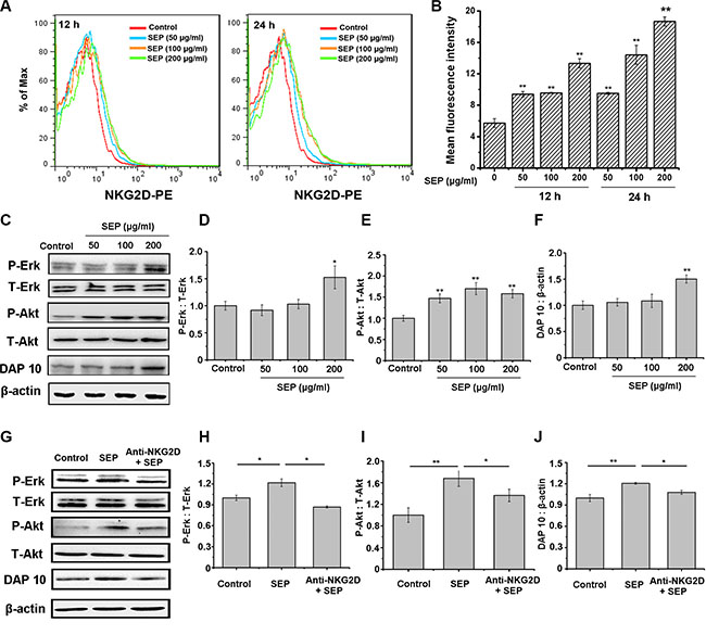 Figure 2: SEP-stimulated NK-92 cells are mediated by NKG2D activation. (A–B) SEP up-regulates the NKG2D expression on NK-92 cells in a dose- and time-dependent manner. The mean fluorescence intensity in each group is examined using flow cytometry. The histogram overlays shown in panel A are representative of triplicates, and the combined results are presented in panels B. (C–F) SEP activates the expression of DAP10 and the phosphorylation of Akt and Erk in NK-92 cells after 24 h. Densitometric analysis of Erk (D) and the phosphorylation of Akt (E) and DAP10 (F) protein levels in Western blots of NK-92 cells (C). Data are shown as the means ± SD from three separate experiments. *P < 0.05 and **P < 0.01 compared with the control group. (G–J) Blocking NKG2D with neutralizing antibody attenuates SEP-activated DAP10 and the phosphorylation of Akt and Erk induced by SEP in NK-92 cells after 24 h. Densitometric analysis of Erk (H), the phosphorylation of Akt (I), and DAP10 (J) protein levels in western blots of NK-92 cells (G). Data are shown as the means ± SD from three separate experiments. *P < 0.05 and **P < 0.01 compared with the SEP-treated group. Representative blots are shown from three independent experiments.