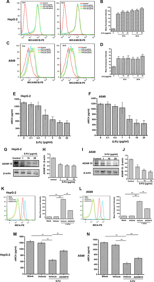 Figure 3: 5-FU enhances and maintains the expression of membrane MICA on HepG-2 and A549 cells by preventing ADAM10 expression. (A–D) The membrane MICA expression on HepG-2 and A549 cells is enhanced after being exposed to 20 μg/mL of 5-FU for 24 h. The mean fluorescence intensity in each group is examined using flow cytometry. The histogram overlays shown in panels A and C are representative of triplicates, and the combined results are presented in panels B and D. (E–F) 5-FU inhibits sMICA secretion in a dose-dependent manner in the supernatant of HepG-2 (E) and A549 (F) cells after 24 h. (G, I) 5-FU suppresses the protein expression of ADAM10 in HepG-2 (G) and A549 (I) cells in a dose-dependent manner. H, J. Densitometric analysis of ADAM10 protein levels in Western blots of HepG-2 (H) and A549 cells (J). Values are presented as the means ± SD from three separate experiments. **P < 0.01 compared with the control group. Shown are representative blots from three independent experiments with similar results. (K–L) The increasement of membrane MICA expression on HepG-2 (K) or A549 cells (L) induced by 5-FU is impaired by the overexpression of ADAM10. Tumor cells were divided into ADAM10 group (ADAM10-overexpressed plasmid group), vehicle group (blank-Vector-transfected group) and blank group (no DNA-transfected group), and then incubated with 5-FU (20 μg/mL) for further 24 h. The mean fluorescence intensity in each group is analyzed using flow cytometry. The histogram overlays shown in left panels are the representative of triplicates, and the combined results are presented in right panels. (M–N) ADAM 10 overexpression attenuates 5-FU-suppressed sMICA secretion in the supernatant of HepG-2 (M) and A549 (N) cells was weaken in the ADAM 10 overexpression group. Data are presented as the means ± SD from three separate experiments. **P < 0.01 compared with the cells in the vehicle group treated with 5-FU.