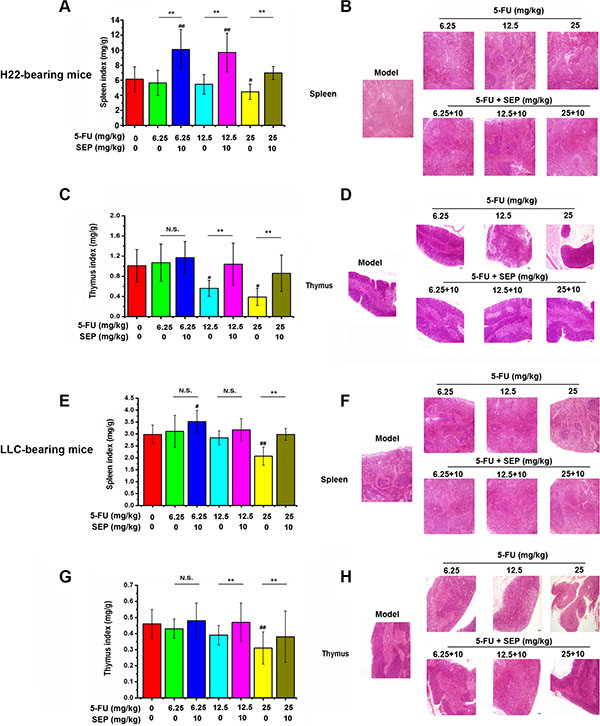 Figure 5: Atrophy of the thymus and spleen caused by 5-FU is attenuated by SEP in vivo. (A, C, E, G) SEP up-regulates the indices of the thymus and spleen, which are decreased by 5-FU in H22- or LLC-bearing mice. (B, D, F, H) Hematoxylin-eosin (H&E) staining of the thymus and spleen present the atrophy and lesions of these two tissues in the SEP and 5-FU administered groups, which were alleviated compared with 5-FU alone treated group. Representative micrographs are shown (100×, H&E stain). N = 12; values are presented as the means ± SD. ##P < 0.01 compared with the control group. *P < 0.05, **P < 0.01, and N.S. (short for no significance) compared with the corresponding dose of the 5-FU group.