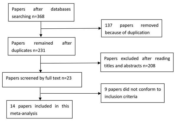 A total of 368 papers were yielded after our initial search. After removing duplicates and screening the titles and abstracts, 345 papers were removed. Therefore, 23 papers were selected for further full text review. Four papers were not case-control studies [21-24]; one was a review [25]; four did not provide detailed genotype data [26-29]. Finally, we identified fourteen eligible papers [7-20] including nineteen studies in this meta-analysis. Selection for eligible papers included in this meta-analysis was presented in Figure 1. The characteristics of these included papers are summarized in Table 1. These papers were published from 2008 to 2014. All included studies conformed to HWE. The NOS scores of all included studies ranged from 5 to 7 stars, indicating that they were studies of high methodological quality. Seven studies were carried out in China [8, 9, 14, 17-20], three in Singapore [7, 19], and six in Taiwan [7, 11-13, 19]; the remaining three studies were carried out in Malaysia [15], Thailand [10] and South Korea [16].
