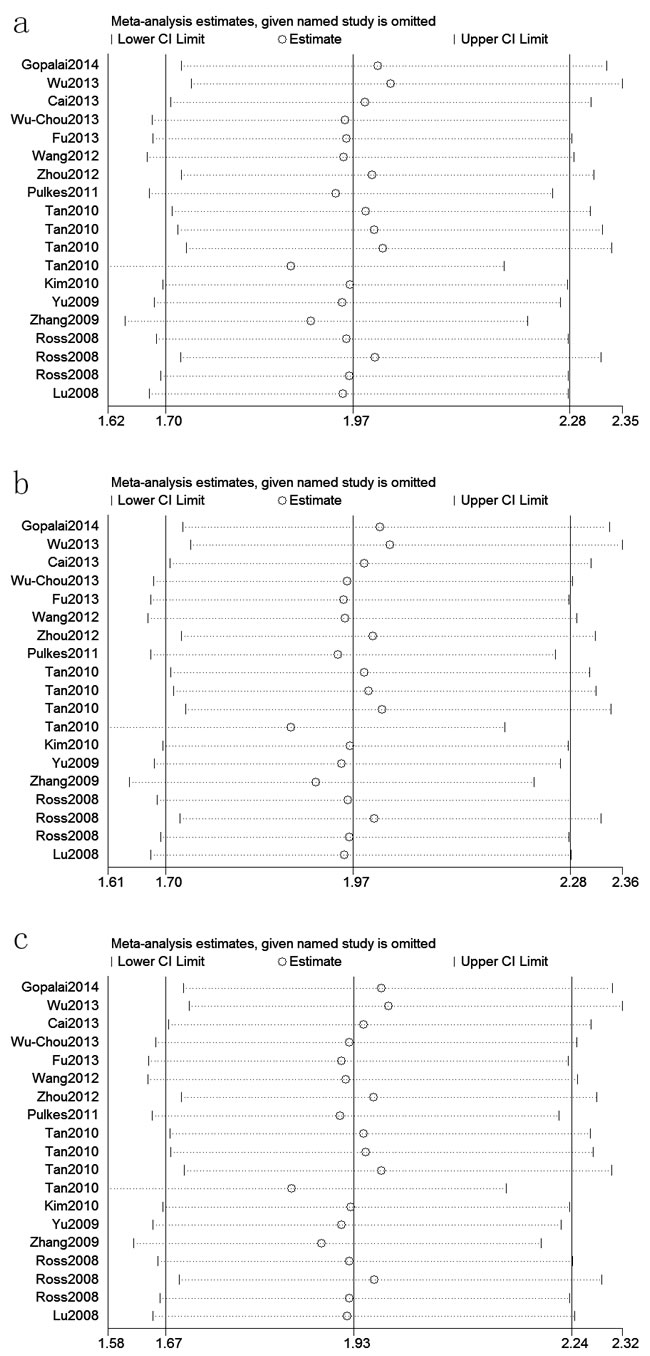 Figure 4: Sensitivity analyses between LRRK2 R1628P polymorphism and PD risk (C vs. G; b: CC+GC vs. GG; c: GC vs. GG)