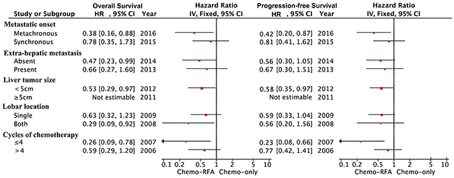 The protective impact of chemo-RFA therapy was not significant among patients with synchronous metastasis, or extra-hepatic metastasis, or those receiving more than four cycles of chemotherapy.