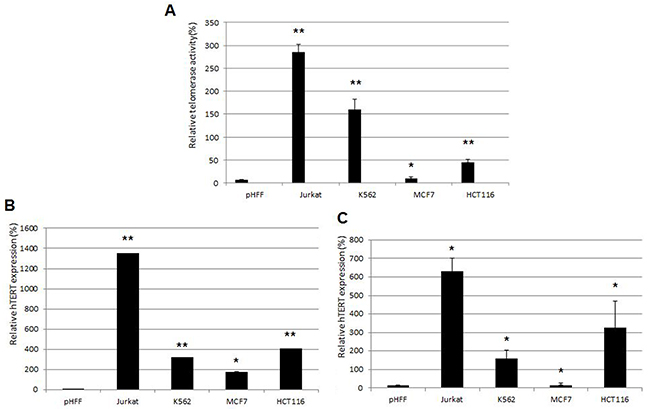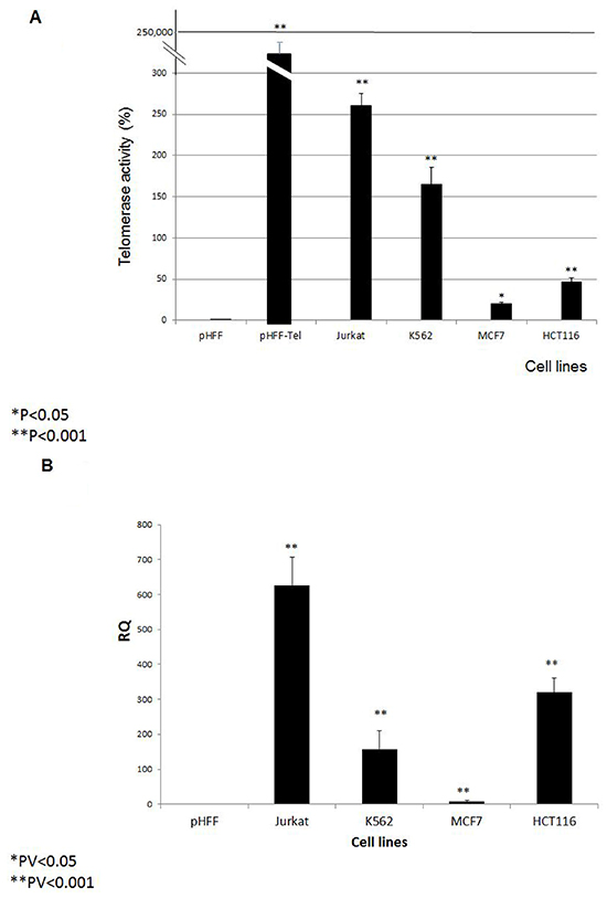 Figure 1: Intracellular hTERT mRNA and telomerase activity. Four cancer cell lines (Jurkat, K562, MCF7 and HCT116), primary fibroblasts (pHFF cells) and primary fibroblasts transfected with the hTERT ORF (pHFF-Tel) were grown and analyzed for: A. Relative telomerase activity by the Q-TRAP assay and B. hTERT mRNA expression by quantitative real time PCR. The bars represent levels of each sample ± S.E of three or more independent experiments conducted in triplicates. * Indicates P<0.05, ** Indicates P<0.001.
