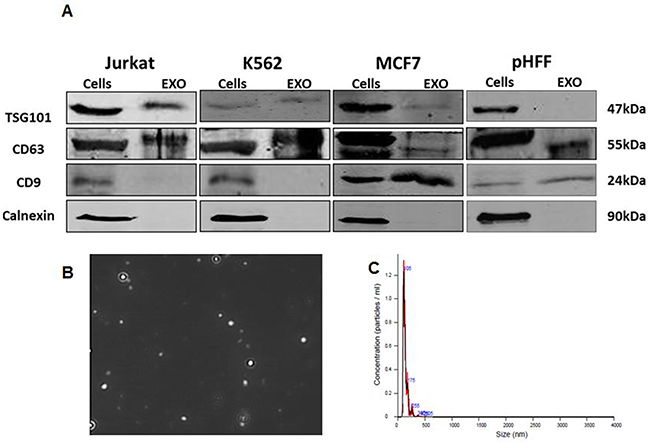 Exosomes were isolated from the growth media of the four cell lines. The purity of the exosomes was verified by assessing the presence of specific exosomal markers (e.g. TSG101, CD9 and CD63) and the lack of non-exosomal marker (calnexin) by Western blot analysis in Jurkat cells (Figure 2A). As expected, calnexin was detected only in total cellular lysates and not in exosomes, indicating that our exosomal fractions are free of cellular components and debris. Furthermore, both TSG101 and CD63 were detected in exosomes derived from all 3 different cancer cell lines (Figure 2A). Figure 2B, 2C depicts the image of the Jurkat cells exosomes presented by the NanoSight imaging system.