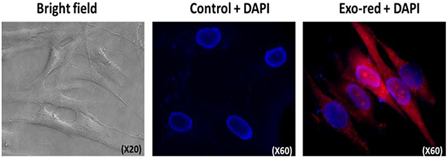 Isolated exosomes were labeled with Exo-Glow exosome labeling kit (System Bioscience, CA, USA) according to the manufacturer’s instructions. Briefly, 50 μl of 10x Exo-Red were added to 500 μL of resuspended exosome in 1x PBS and incubated at 37°C for 10 minutes. The labeling reaction was stopped by adding 100 μl of the ExoQuick-TC reagent and incubated on ice for 30 min. The labeled exosomes were centrifuged, resuspended in 1xPBS and added to 1*105 pHFF cells per well in a 6-well culture plate. The cells with the labeled exosomes were incubated for 2 to 24 hours and visualize by fluorescent microscopy after DAPI staining (GenASIs Scan, Applied Spectral Imaging, Israel).