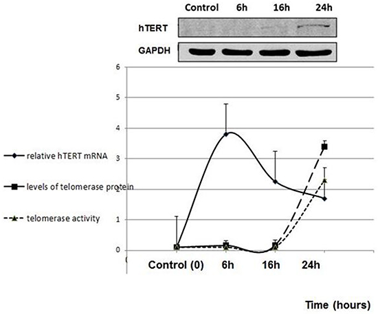 Figure 6: De novo telomerase activity in pHFF cells following Jurkat cells derived exosomal exposure. pHFF cells were subjected to Jurkat-derived exosomes for 6, 16 and 24 hrs. Cells were harvested, lysed and analyzed for the expression of the hTERT mRNA by quantitative real time PCR; telomerase protein levels by Western blotting and telomerase activity by Q-TRAP assay. At the upper panel of the figure a representative image of the Western blot analysis is shown. The graphs represent average values of each sample ± S.E of three or more independent experiments conducted in triplicates.