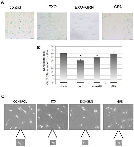 Exosomal telomerase transfer also postponed the cellular senescence as expected in cells with telomerase activity [43]. We used two methods for characterization of senescence: the widely accepted measurement of β-galactosidase activity and the differences in the appearance of nuclear architecture [44–46].