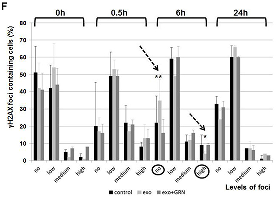 Protection from DNA damage has been reported as an “extracurricular” activity of telomerase. Indeed, the “telomerase activated” fibroblasts were protected from phleomycin induced DNA damage, protection that was abrogated by telomerase inhibition. This was demonstrated six hours after phleomycin exposure, where a statistically significant change between the percentages of cells exposed to exosomal hTERT versus same cells treated also with telomerase inhibitor with no detected DNA damage (represented by the number of γH2AX foci) was observed. The results regarding percentage of cells with high numbers of γH2AX foci were not necessarily significant biologically, although reached a statistical significance.