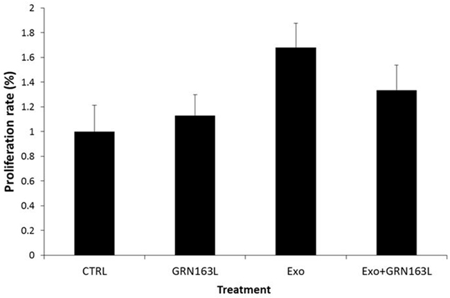 Figure 7: Proliferation rates in response to de novo telomerase activity in pHFF cells. pHFF cells were subjected to Jurkat-derived exosomes (Exo), to telomerase inhibitor (GRN) or to Jurkat-derived exosomes and telomerase inhibitor (Exo+ GRN) twice a week for five weeks. The proliferation rate of the cells was measured by the Trypan blue exclusion assay.