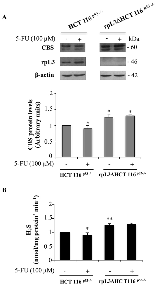 Figure 1: 5-FU induced rpL3 down-regulates CBS expression levels and H2S production. A. Western blotting of rpL3 and CBS protein expression. HCT 116p53-/- and rpL3Δ HCT 116p53-/- cells were treated or not with 100 μM 5-FU for 24 h. Protein extracts from the samples were analyzed by western blotting with antibodies against rpL3 and CBS. β-actin was used as loading control. Quantification of signals is shown. *P < 0.05 vs. untreated HCT 116p53-/- cells. B. Production of H2S from the same samples. **P < 0.01,*P < 0.05 vs. untreated HCT 116p53-/- cells. Results illustrated in Figure 1–7 are representative of three independently performed experiments.