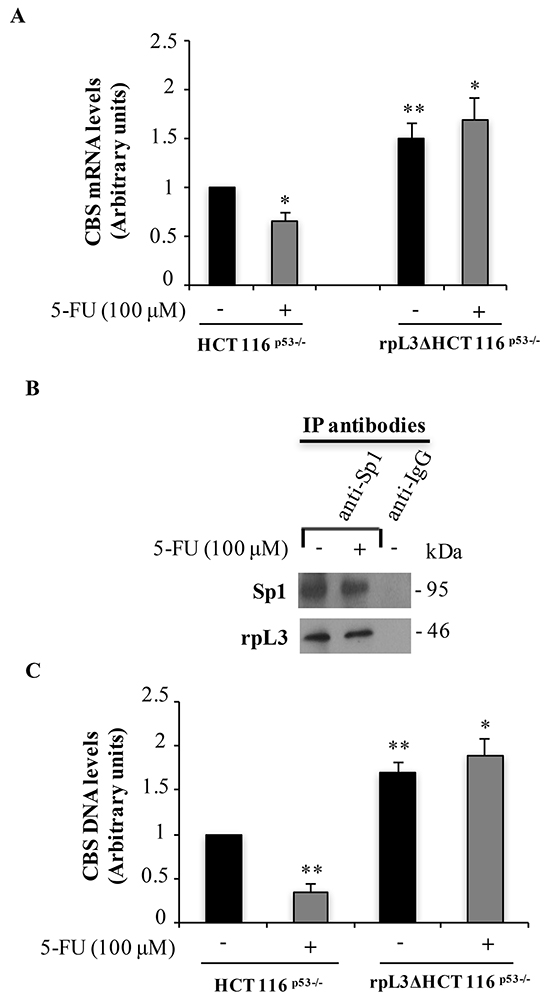 Figure 2: Upon 5-FU treatment, the interaction of rpL3 with Sp1 impairs its binding to CBS promoter and leads to a decrease of CBS mRNA levels. A. Total RNA from HCT 116p53-/- cells untreated or treated with 100 μM 5-FU for 24 h was subjected to qPCR with primers specific for CBS mRNA. Quantification of signals is shown. **P < 0.01,*P < 0.05 vs. untreated HCT 116p53-/- cells. B. Analysis of the interaction between rpL3 and Sp1. Protein samples of Sp1 or IgG immunocomplexes from HCT 116p53-/- cells untreated or treated with 100 μM 5-FU for 24 h were analyzed by western blotting with antibodies against Sp1 and rpL3. Note the absence of signal in IgG immunocomplex. C. Analysis of the interaction between Sp1 and CBS gene promoter. DNA-Sp1 or DNA-IgG immunocomplexes from HCT 116p53-/- and rpL3ΔHCT 116p53-/- cells, untreated or treated with 100 μM 5-FU for 24 h, were analyzed by qPCR with primers specific for CBS gene promoter. Quantification of the signals is shown. **P < 0.01,*P < 0.05 vs. untreated HCT 116p53-/-cells.