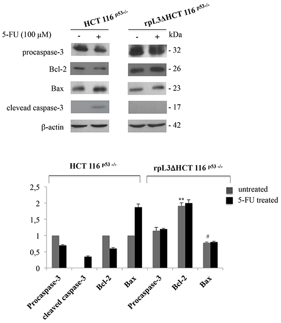 Figure 4: rpL3 activates mitochondrial apoptosis upon 5-FU treatment. Representative western blotting of procaspase-3, Bcl-2, Bax and active clevead caspase-3 protein expression. HCT 116p53-/- and rpL3ΔHCT 116p53-/- cells were treated or not with 100 μM 5-FU for 24 h. After the treatment, protein extracts from the samples were analyzed by western blotting with the indicated antibodies. β-actin was used as control. Quantification of the signals is shown. **P < 0.01 vs. Bcl-2 in untreated HCT 116p53-/- cells; # P < 0.05 vs. Bax in untreated HCT 116p53-/-cells.