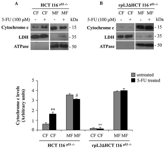 Figure 6: rpL3 translocation upon 5-FU treatment mediates the release of cytochrome c from mitochondria. Representative western blotting of cytochrome c protein expression. A. HCT 116p53-/- and B. rpL3Δ HCT 116p53-/- cells were treated or not with 100 μM 5-FU for 24 h. After the treatment, cells were subjected to fractionation to obtain the cytosolic fraction (CF) and the mitochondrial fraction (MF). Protein extracts from the samples were analyzed by western blotting with antibodies against cytochrome c. LDH and ATPase were used as controls for CF and MF, respectively. Quantification of the signals is shown. **P < 0.01 vs. cytochrome C in CF from untreated HCT 116p53-/- cells; #P < 0.05 vs. cytochrome C in MF from untreated HCT 116p53-/- cells; °° P < 0.01 vs. cytochrome C in MF from 5-FU treated HCT 116p53-/- cells.