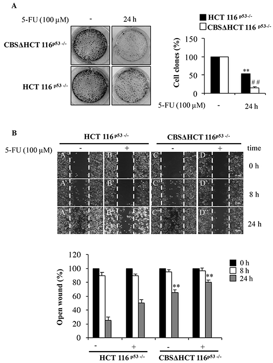 Figure 7: Depletion of CBS decreases cell proliferation and migration. A. Representative images of clonogenic analysis for cell proliferation in HCT 116p53-/- and CBSΔHCT 116p53-/- cells after 5-FU treatment. **P < 0.01 vs. untreated HCT 116p53-/- cells; ##P < 0.01 vs. untreated rpL3Δ HCT 116p53-/-cells. B. Representative images of wound healing assay for cell proliferation in HCT 116p53-/- and CBSΔHCT 116p53-/- cells after 5-FU treatment. Wound widths were measured at 0, 8 and 24 h on 3 fields per well and averaged. Data is expressed as the fold-decrease of area respect to controls (A, B, C, D) set as 100%. **P < 0.01 vs untreated HCT 116p53-/- cells.