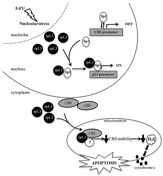 Given these observations, in the attempt to characterize the molecular mechanism underlying rpL3-mediated cell response to 5-FU chemotherapy in colon cancer, we have investigated the existence of a regulatory mechanism of CBS expression mediated by rpL3. Here we provide for the first time evidences supporting the existence of a new extraribosomal function of rpL3, that is its regulatory role on the expression of the cytosolic enzyme CBS. In particular we demonstrate that in presence of 5-FU induced nucleolar stress, ribosome free rpL3 is able to: i) downregulate Sp1-mediated CBS transcription; ii) trigger mitochondrial translocation of CBS; iii) modify CBS protein stability; iv) induce mitochondrial apoptosis mediating the increase of Bax/Bcl-2 ratio, cytochrome c release and caspase activation.