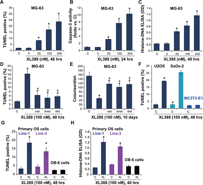 Figure 2: XL388 induces caspase-dependent apoptosis activation in OS cells-MG-63. (A–C), U2OS (F) and SaOs-2 (F) OS cell lines, the primary human OS cells (line-1/-3) (G and H), as well as mouse osteoblastic MC3T3-E1 cells (F) and human OB-6 osteoblastic cells (G and H) were treated with applied concentration of XL388, cells were further cultured, and cell apoptosis was tested by listed assays. MG-63 cells, pretreated with z-VAD-fmk (vad, 25 μM), z-DVED-fmk (dved, 25 μM) or z-ITED-fmk (ited, 25 μM) for 1 hour, were stimulated with XL388 (100 nM), TUNEL staining assay (D) and colony formation assay (E) were performed. n = 5 for each assay. *p < 0.05 vs. group “C”. #p < 0.05 vs. XL388 only group (D–E).